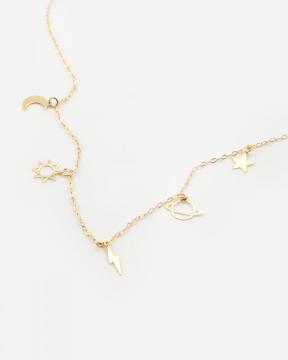 Este collar en oro de 18kt tiene un diseño moderno y fascinante. Con colgantitos del universo y una cadena ajustable, es una elección perfecta para cualquier edad. Añade un toque de misterio y estilo a cualquier outfit, desde casual hasta formal, convirtiéndose en una joya versátil e imprescindible en tu colección.