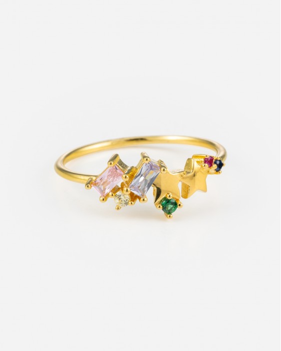 Este anillo de plata de ley bañado en oro presenta vibrantes piedras de colores y delicadas estrellas, lo que lo hace perfecto para cualquier edad. Con su diseño alegre y divertido, este anillo es una opción perfecta para añadir un toque de color a cualquier conjunto.
