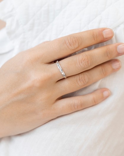 Esta sortija de oro blanco de 18kt con circonitas es una joya elegante y versátil que se adapta perfectamente al uso diario o a ocasiones especiales. Las circonitas que adornan la sortija le dan un brillo sutil y sofisticado. Su diseño atemporal y la calidad del oro blanco la convierten en una joya duradera y hermosa.