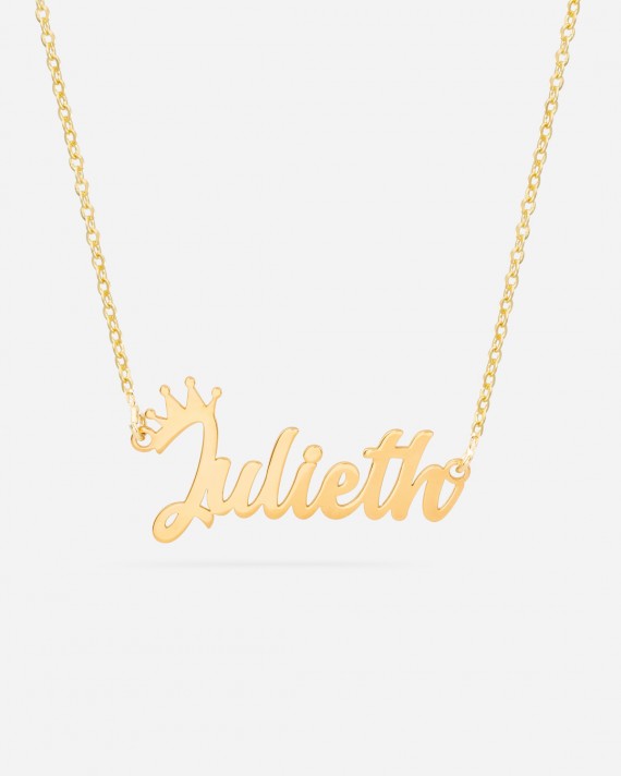 El collar con nombre y motivo de corona en plata de ley bañado en oro de 18kt es una joya refinada y personalizada. El nombre dorado y la corona le da un toque de elegancia y sofisticación. El diseño clásico y atemporal del collar es perfecto para cualquier ocasión especial. Es un regalo maravilloso y duradero que seguro será apreciado por su diseño elegante.