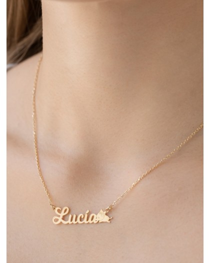 El collar con nombre con motivo de perro en plata de ley bañado en oro de 18kt es una joya divertida y personalizada con mucho estilo. El nombre y el diseño de perro en oro le dan un toque de elegancia y sofisticación al collar. Es perfecto para dar como regalo a los amantes de las mascotas o para usar a diario. Es una joya única que seguro llamará la atención por su estilo chulo y encantador.