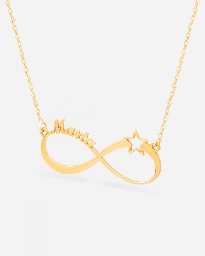 - Este collar personalizado es la perfecta unión de estilo y elegancia. Con un diseño de infinito con estrella, simboliza la conexión eterna y la iluminación. Hecho en Plata de Ley de alta calidad y exquisitamente bañado en oro de 18kt, puedes personalizarlo con hasta tres nombres para crear una joya única y especial. Este collar con nombre es una declaración de refinamiento y distinción.