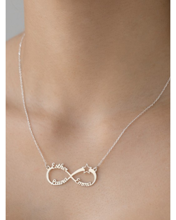- Este collar personalizado es la perfecta combinación de estilo y significado. Con un diseño de infinito con estrella, simboliza la conexión eterna y la iluminación. Hecho en Plata de Ley de alta calidad, puedes personalizarlo con hasta tres nombres para crear una joya única y especial. Añade un toque de elegancia y personalidad a cualquier outfit con este collar con nombre.