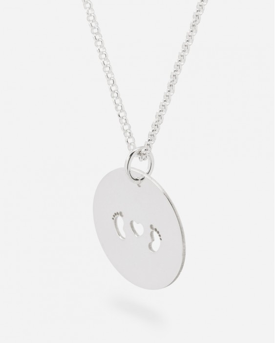 El collar en plata de ley con un tierno diseño de corazón y pies de bebés es una joya personalizada llena de amor. La medalla calada permite la personalización con nombres, fechas ó datos de nacimiento, mientras la cadena ajustable lo hace ideal para todas las edades. Un regalo encantador que celebra la vida.