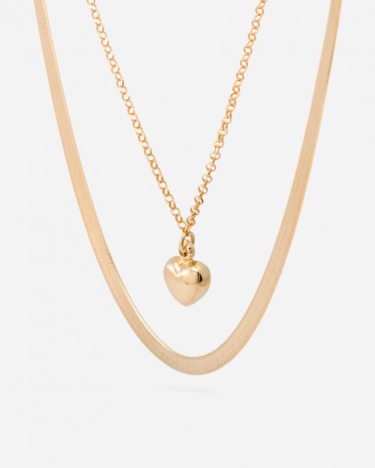 El collar "Margor" cautiva con su doble cadena: una interior con un corazón central y otra exterior de diseño serpiente. Fabricado en plata de ley con un baño de oro de 18 quilates, estas joyas atemporales emanan elegancia y distinción, adecuadas para cualquier ocasión con gracia y estilo.