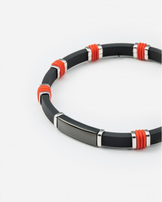 ¡Esta pulsera de caucho y acero es todo lo que un hombre necesita! Adaptable y resistente, es ideal para el día a día. Con detalles en rojo que le dan un toque de color, puedes personalizarla con nombres o mensajes grabados en su placa de cerámica. ¡Un regalo perfecto para cualquier ocasión!