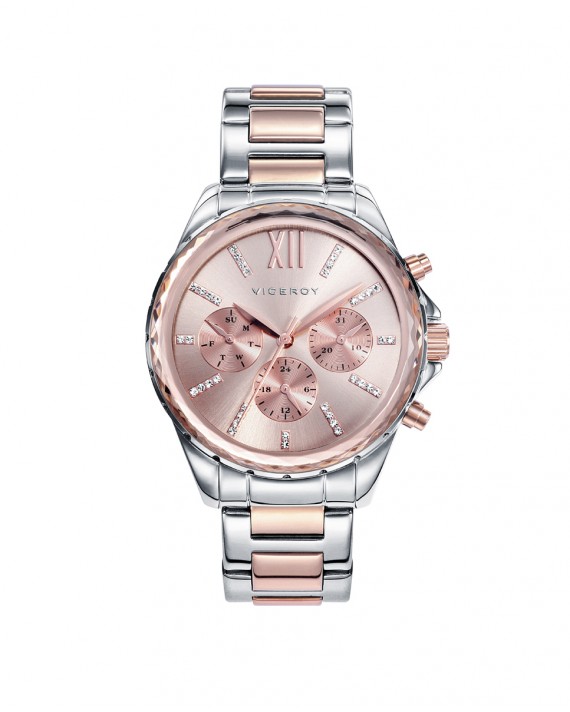 Este reloj de mujer Viceroy de la colección Chic multifunción es una pieza que exuda sofisticación y elegancia. Este reloj cuenta con incrustaciones de circonitas en la esfera, aportando un brillo delicado y refinado. El brazalete es bicolor, alternando acero con un acabado en IP rosa que armoniza perfectamente con el bisel y la esfera. Su cierre desplegable por pulsadores garantiza comodidad y seguridad. Además, es impermeable hasta 50 metros y cuenta con un fondo de rosca, asegurando su durabilidad y funcionalidad. Ideal para la mujer moderna que busca un accesorio versátil y distinguido para cualquier ocasión.