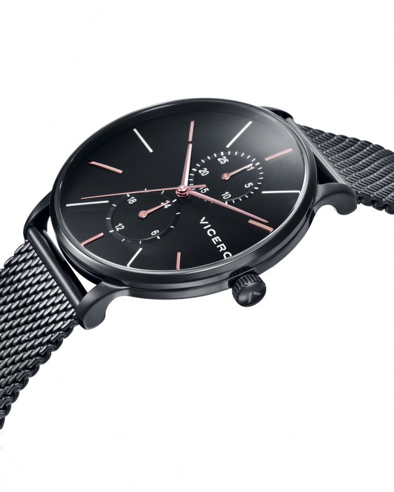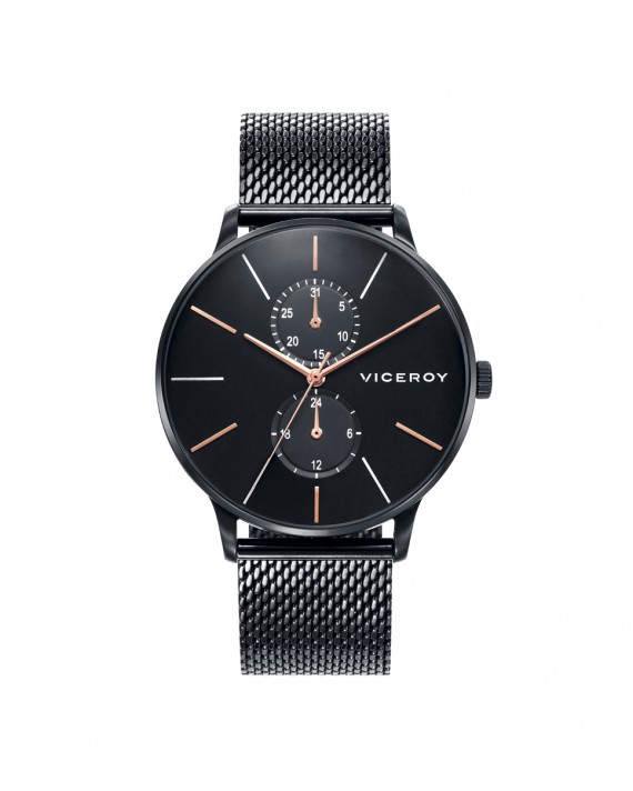 Reloj de hombre Viceroy Beat multifunción. Presenta un diseño moderno y sofisticado con caja y malla milanesa de acero en IP negra. Su esfera y contadores en negro, junto con índices en rosado y blanco, ofrecen un contraste elegante y distintivo. Perfecto para el hombre que busca un accesorio funcional y estilizado.