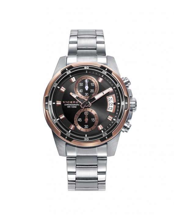 Reloj Viceroy Hombre 401239-57 Acero. Caja de acero. Brazalete de acero. Esfera negra. Bisel rosado. Cronógrafo. Sumergible 100m. 2 años de garantía.