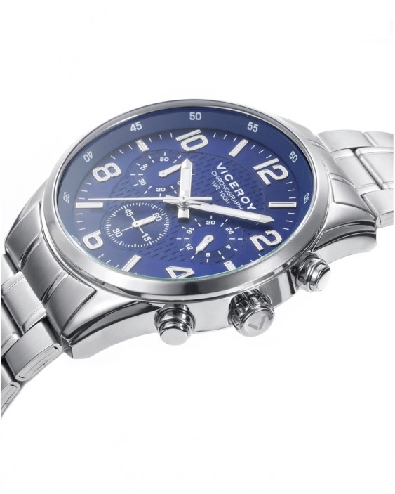 Reloj para hombre Viceroy con cronógrafo perfecto para cualquier ocasión. Presenta una caja y brazalete de acero inoxidable que le otorgan un aspecto duradero y sofisticado. La esfera azul está diseñada con índices en blanco que contrastan armoniosamente con el fondo, facilitando la lectura de la hora.