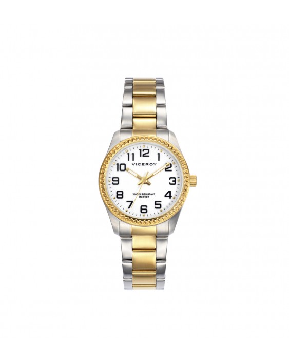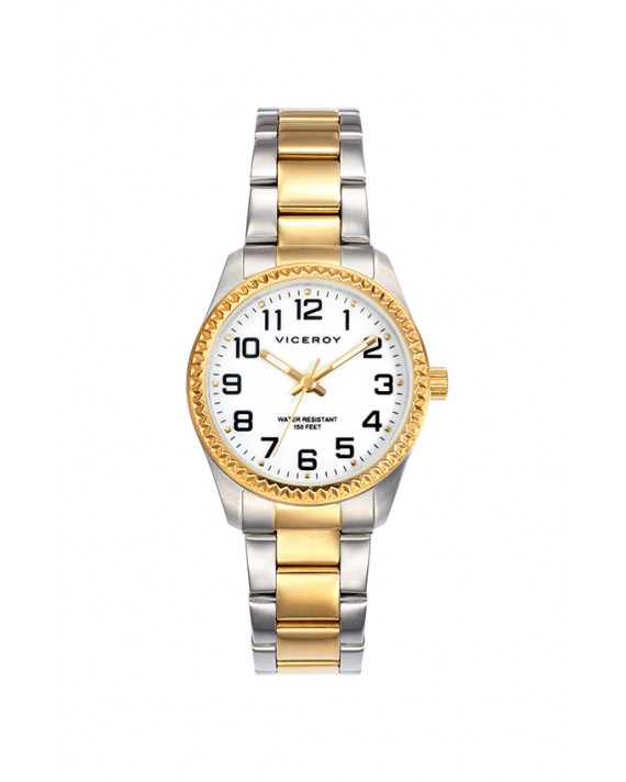 Este reloj de mujer Viceroy combina elegancia y sofisticación con su diseño bicolor. Presenta una caja y brazalete de acero con detalles en IP dorado, aportando un toque lujoso. Su esfera blanca está adornada con números árabes, facilitando una lectura clara y precisa. Las agujas en tono dorado complementan armoniosamente el diseño, añadiendo un toque de refinamiento. Este reloj es ideal para la mujer que busca un accesorio versátil y distinguido, perfecto para cualquier ocasión, desde eventos formales hasta el uso diario.