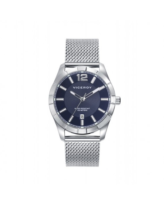 Reloj deportivo de Hombre Viceroy Magnum Style, tres agujas, caja y malla milanesa de acero, esfera azul con índices y número romano a las 12 en color plata, agujas en color plata.