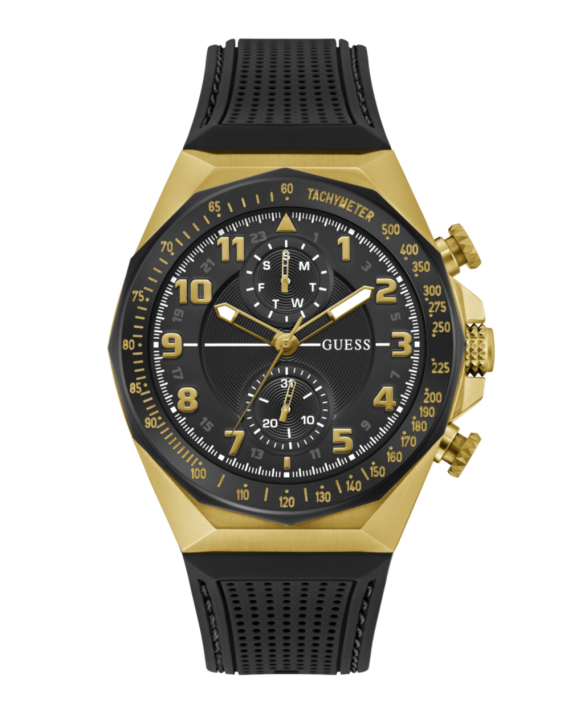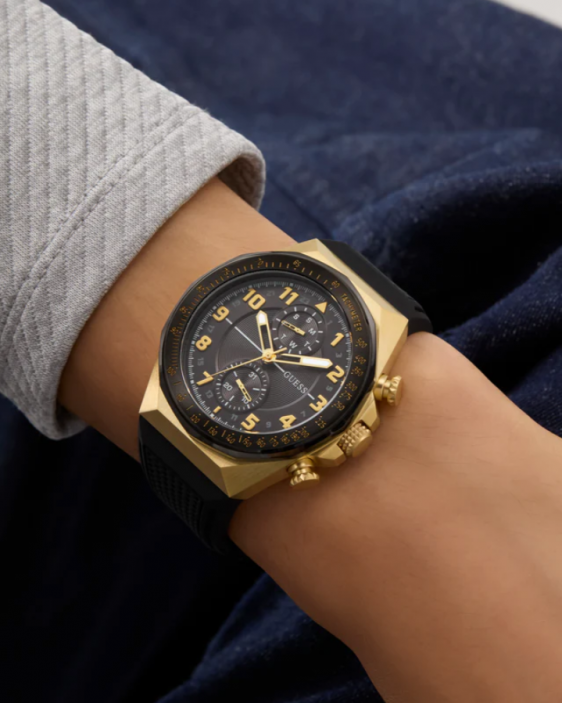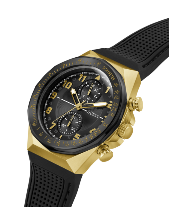 Descubre el elegante reloj Guess D1 GW0902G1, un reloj analógico para hombre con un diseño distintivo que combina estilo y funcionalidad. Este modelo de la colección D1 cuenta con caja redonda de 46 mm en acero inoxidable bicolor negro y dorado, con esfera multifunción y cristal mineral resistente. Su correa negra de silicona proporciona comodidad y versatilidad para uso diario o eventos especiales. Con una resistencia al agua de 50 m (5 ATM), este reloj es perfecto para afrontar la rutina sin perder estilo.