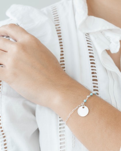 ¡Deslumbra con esta pulsera de plata de ley y turquesas! Personalízala con nuestro disco personalizable, grabando uno de nuestros diseños o creando el tuyo propio. Además, su adaptabilidad la hace perfecta para cualquier muñeca. ¡Llévala sola o combínala con otras pulseras para un look más divertido! ¡Es para todas las edades!