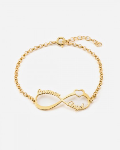 Esta pulsera de nombre Infinito es una joya que representa el amor eterno. Personalizada con hasta 3 nombres, está hecha de Plata de Ley bañada en Oro de 18kt y cuenta con un delicado corazón. Es el regalo perfecto para expresar amor y compromiso, simbolizando una conexión que durará para siempre.