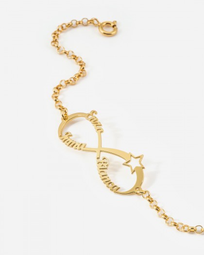 Esta pulsera personalizada es un tesoro brillante que llevarás contigo siempre. Con un diseño elegante y femenino, la estrella y el infinito agregan un toque de magia. Hecha con Plata de Ley bañada en Oro de 18kt, esta pulsera de calidad puedes personalizarla con hasta tres nombres para hacerla aún más especial y significativa. Perfecta para cualquier ocasión, es un regalo único y conmovedor para alguien muy especial.